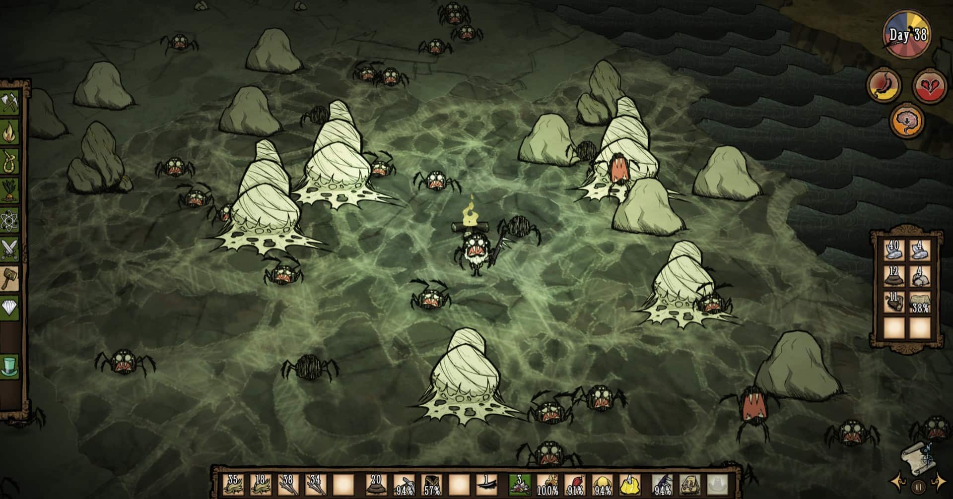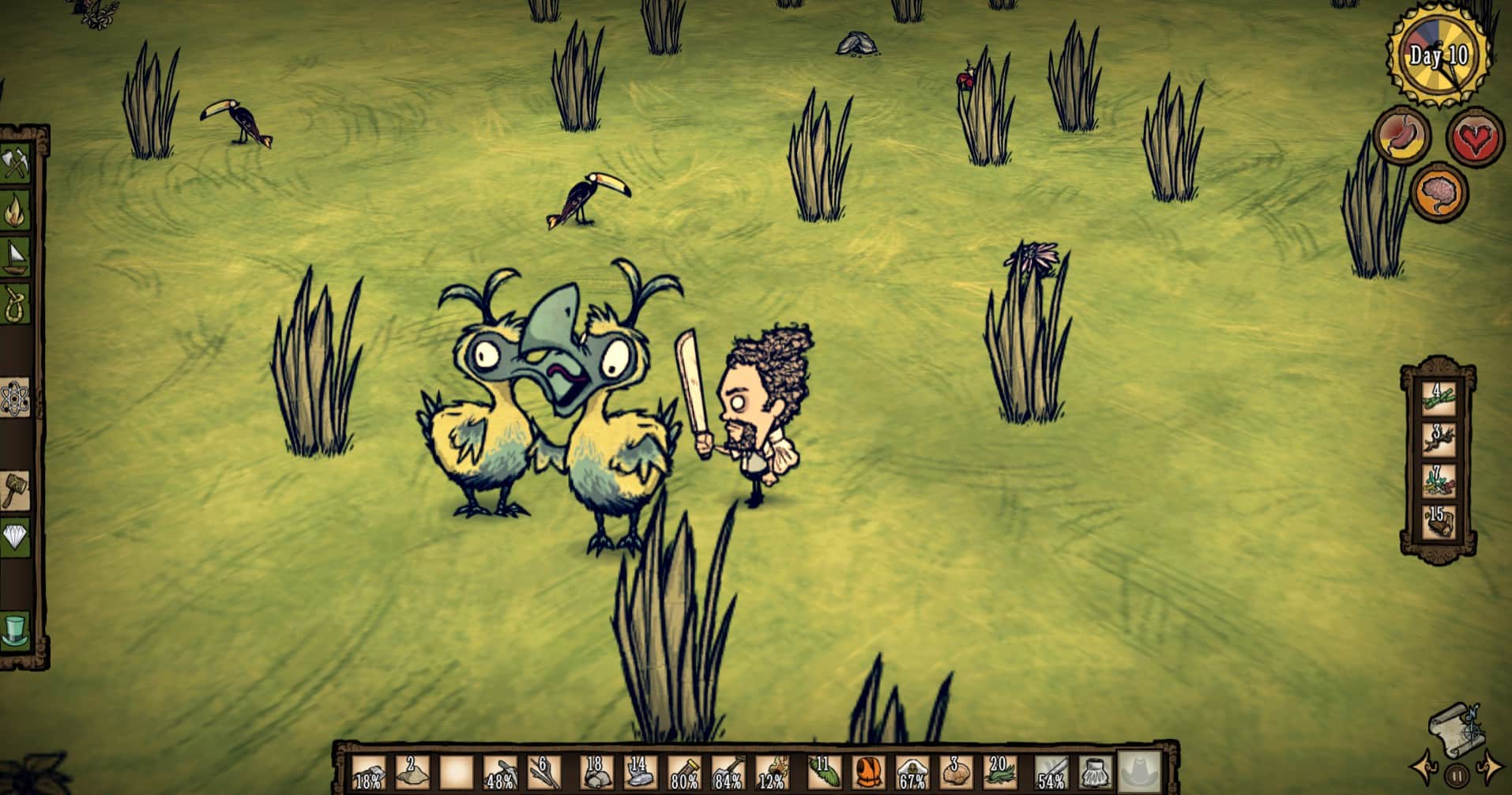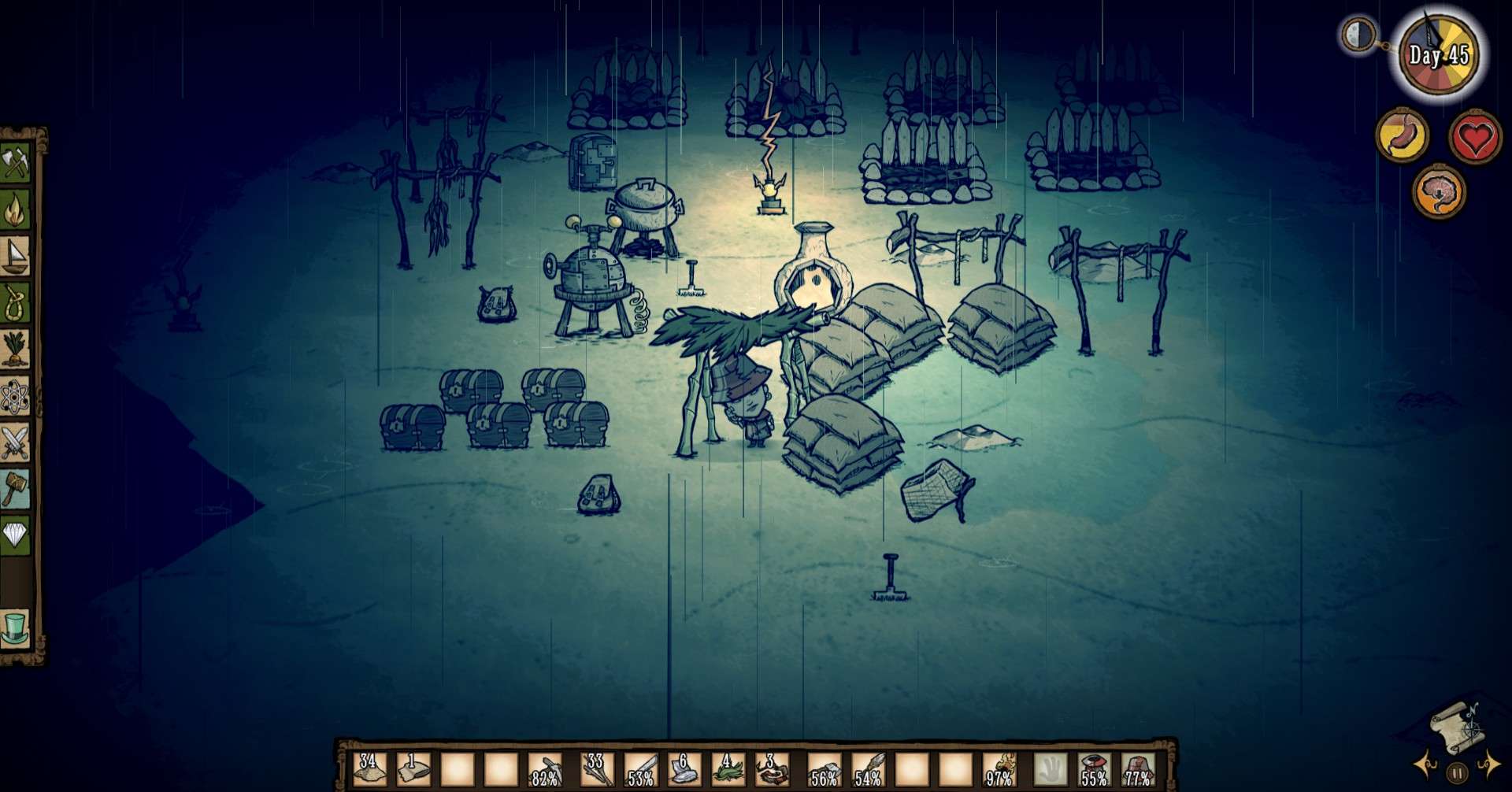 If you’ve been playing Don’t Starve for a while now and have laid down a set of standard tactics for yourself, don’t expect them to remain the same in Shipwrecked. The change from winter to hurricane season alone is sure to throw the average player off. If you don’t read the wiki, experienced players will find themselves unprepared in every season except the calm season. Food is no longer as great as a problem here as it was in the original game. Rather than risking starvation every day and dying in attempts to prevent it, I often found that food was more common. The player can easily survive by collecting limpets off of rocks, catching crabs on the beach (which are easier to catch than rabbits), or even just eating seaweed scattered on the shores of the island. On the other hand, resources you need to survive the upcoming season are more scarce and the environment is more deadly which can often lead to death during exploration. Keep in mind, the DLC is still early access so there could be a lot of changes from the time I write this review to when it’s fully released.