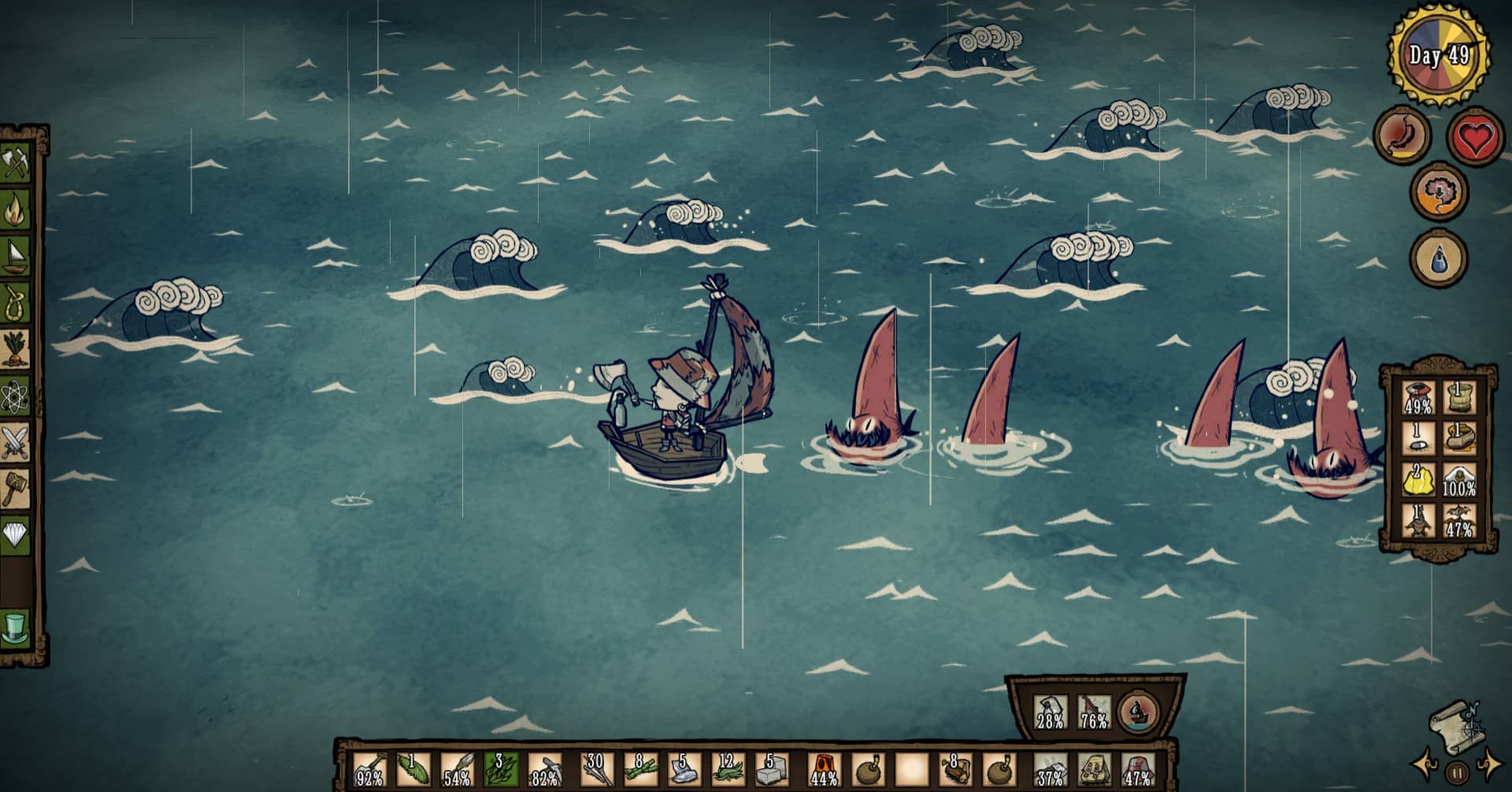Shipwrecked builds upon the original gameplay, tweaks it, and brings loads of new features to the table. New seasons will force you to adapt your strategies, new monsters are out to kill and surprise you, debuffs such as poison will slowly whittle away your health, new characters which are still a work in progress, and best of all, sailing. In the normal game, the ocean acts as a natural barrier for the player, forcing you to go in a different direction. The more you deviate from the center of the map, the more you will see how this can often lead to a linear land mass. You may want to get to a forest but first you have to cut across a plains biome with no alternative route, and so on. However, in Shipwrecked the ocean becomes traversable via rafts early game and eventually larger boats. Rather than wandering through a forest, you awaken to an island paradise. You’ll find yourself bouncing from island to island in search of resources which aren’t available on the island you made your base on. If you don’t reach land before nightfall and also lack a sail or boat lantern, you’ll be stuck out in the ocean, holding a torch, and praying the crashing waves don’t sink your boat. The oceans also aren’t a safe spot from the dogs or other monsters. If you’re stuck out on the ocean when dogs would normally spawn, they become sea hounds which are more difficult to deal with early game because they’ll likely sink your boat if you don’t run away. Other monsters such as swordfish and stink rays can also attack you or your boat.